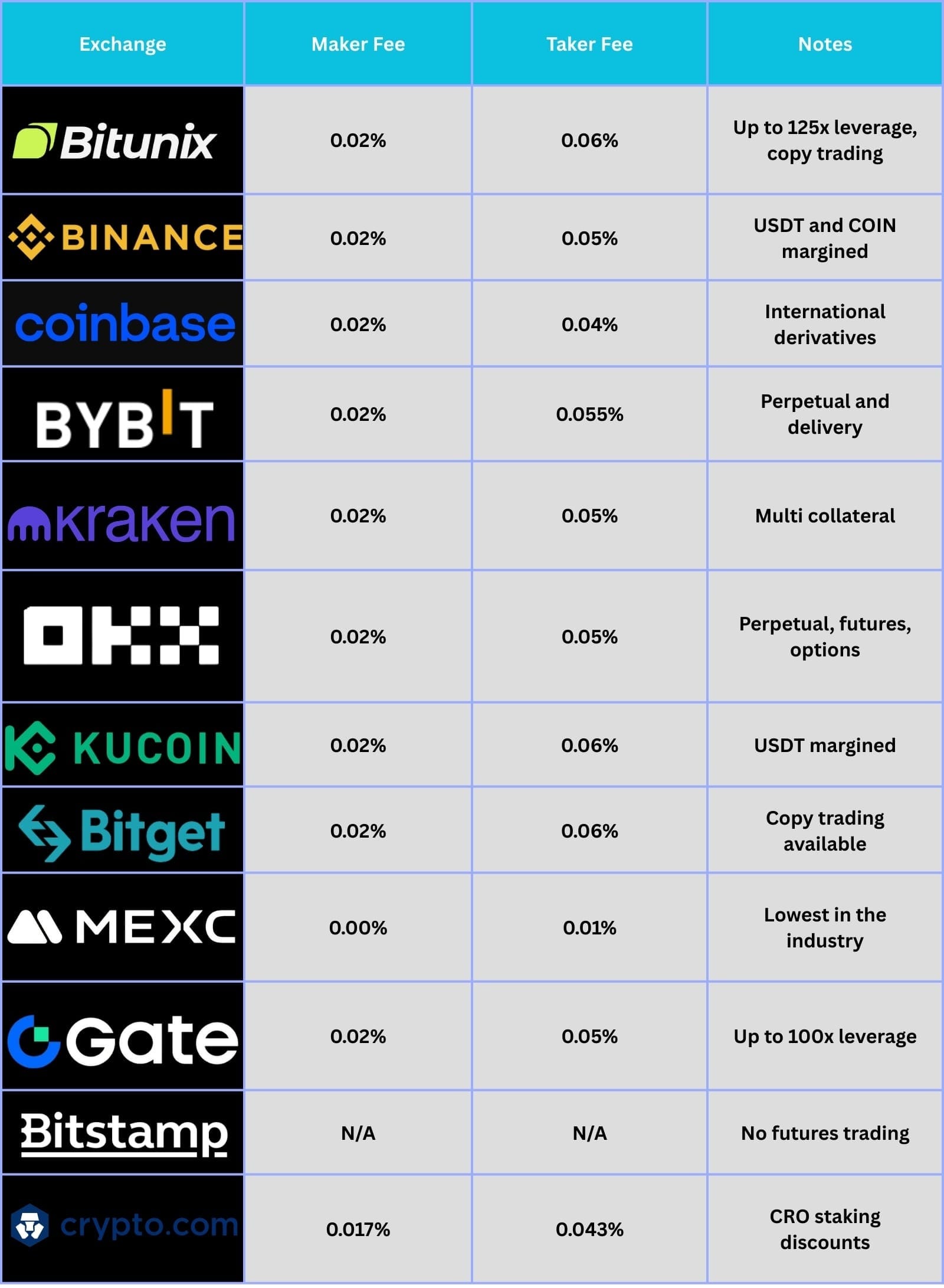 Bybit and Binance lead the derivatives market in 2026. Both offer 0.02% maker fees with high liquidity. Bitunix is a strong contender for futures traders who also want copy trading, offering the same 0.02% maker rate with up to 125x leverage and nearly 2,000 lead traders to follow. MEXC is the cheapest option, but its liquidity on less popular pairs can be thinner.