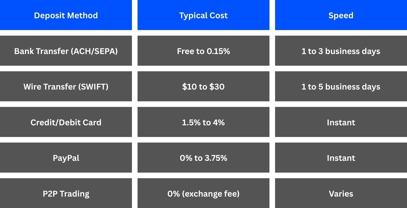 Bottom line: Always use bank transfers when possible. Credit card deposits are the most expensive way to fund a crypto account. That 3.99% Coinbase card deposit fee on a $1,000 purchase costs you $39.90 before you even make a trade.