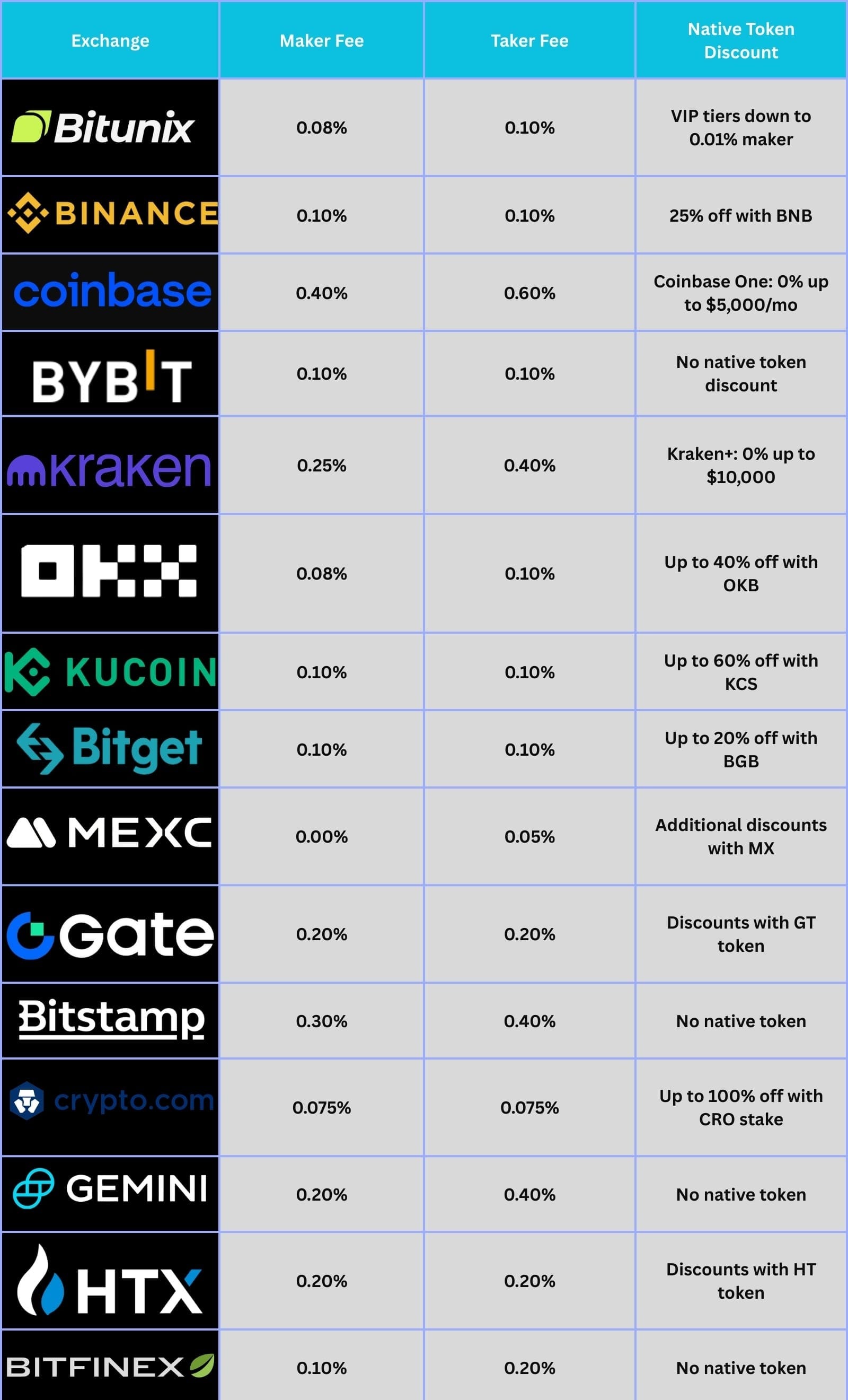 MX (MEXC): Additional fee reductions on already low base fees. Smaller market cap token, so higher price risk.