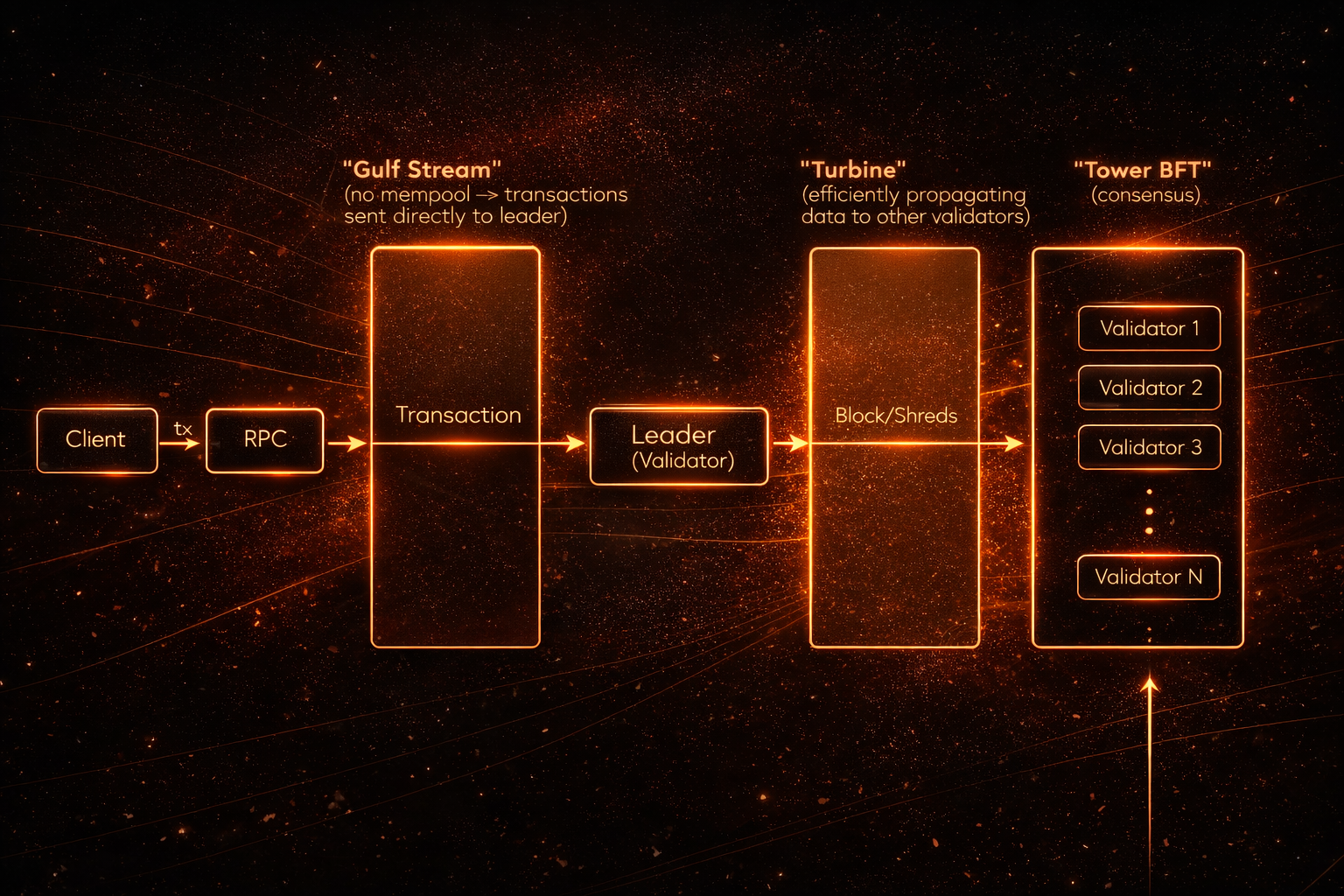 Turbine. A block propagation protocol inspired by BitTorrent. Instead of sending entire blocks to every node, Turbine breaks data into small packets and distributes them across the network in parallel.